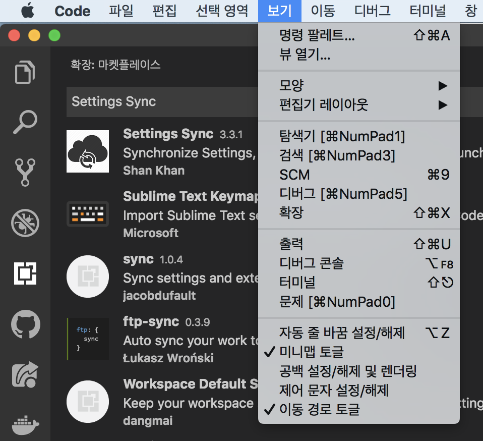 명령 팔레트에서 Sync 을 눌러서 설정을 해주시면됩니다.