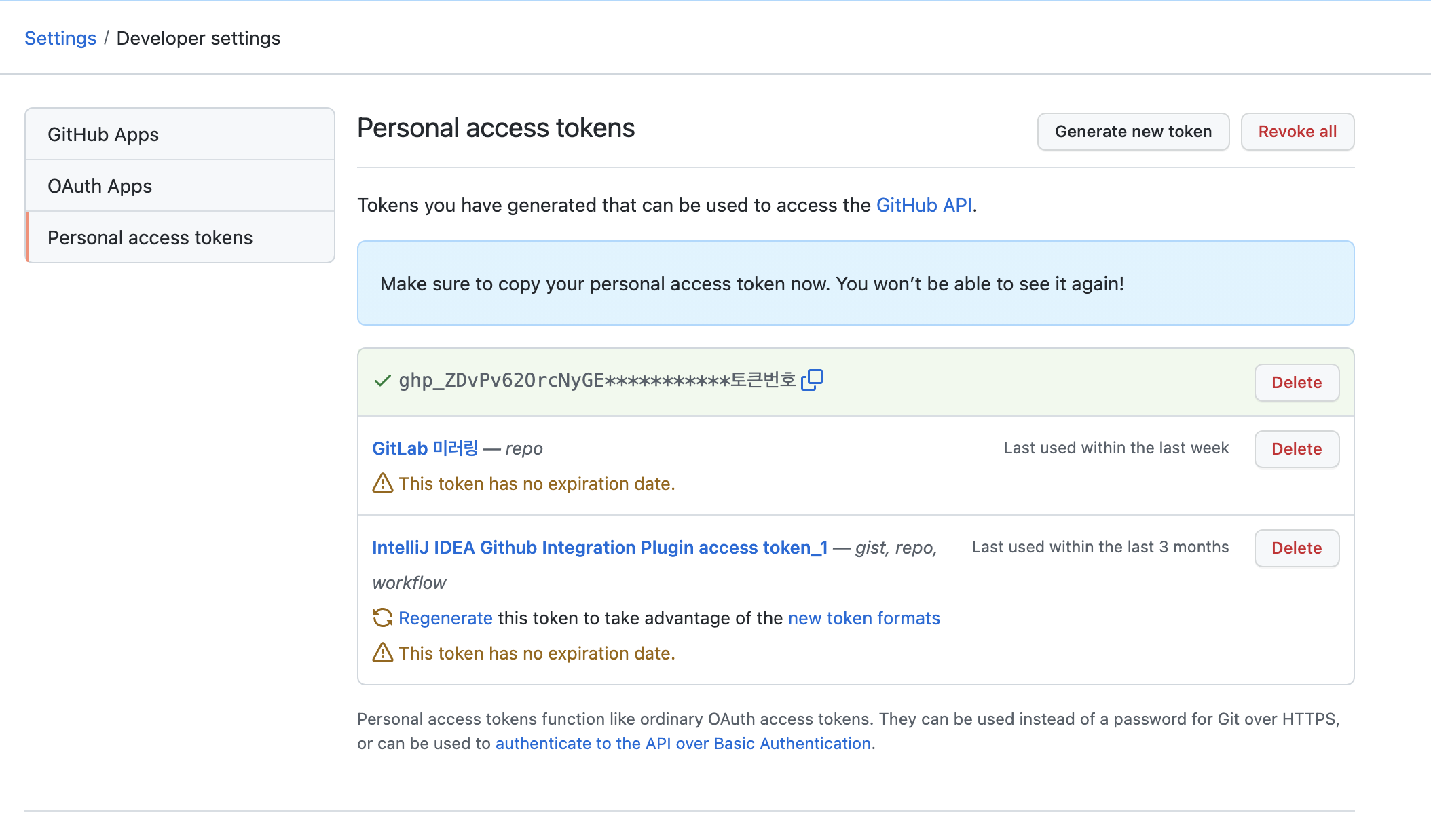 Generate new token으로 미러링용 토큰 생성하기 (저는 이미 있습니다.)