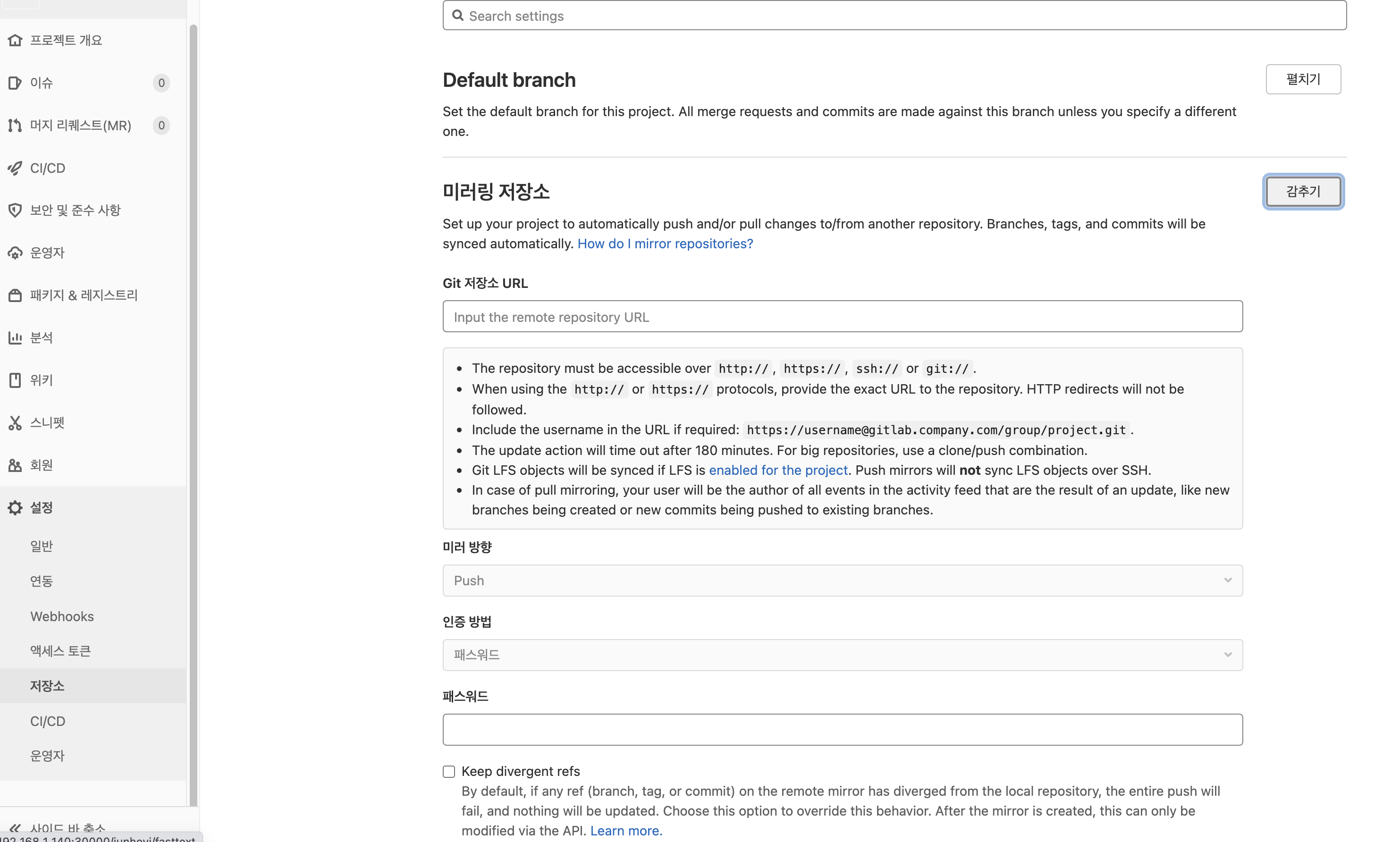 GitLab으로 이동 → 프로젝트로 이동 → 설정 → 저장소→ 펼치기